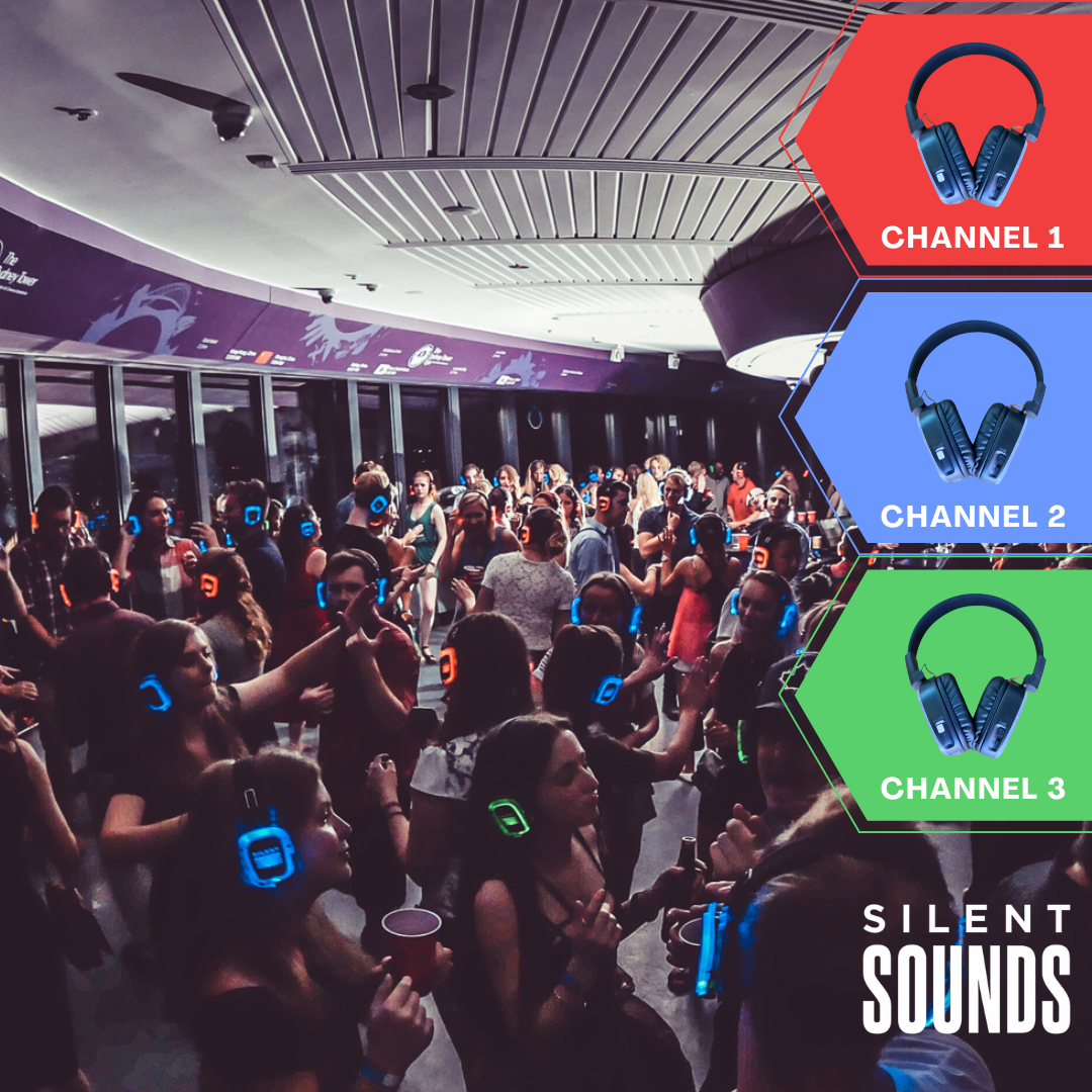 Our systems are simple to set up and use with our plug-and-play technology. You can connect any device i.e. smartphones, DJ equipment, and laptops as your audio source. Our transmitter will send sound wirelessly to the headphones via radio frequency. Our system supports up to 3 channels to play multiple audio sources simultaneously. You can also add microphones if needed.