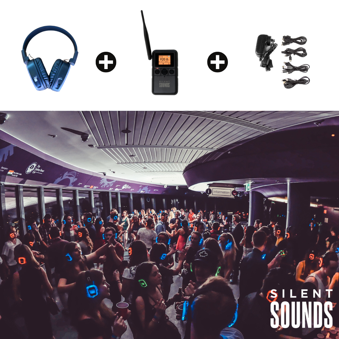 This kit is the perfect starter for any silent event. Simply add more headphones if you have more guests, more transmitters if you want more channels or a microphone to do music and voice. This is kit comes with: